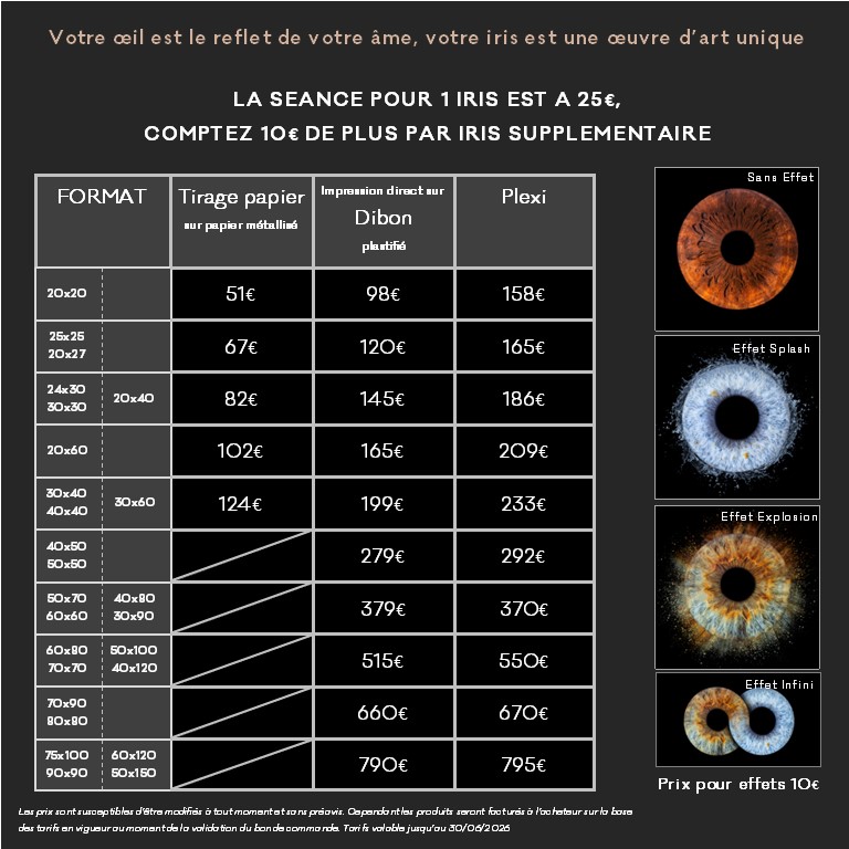 Il y en a pour tous les goûts ! Plusieurs compositions et effets vous sont proposés afin de mettre en avant l’œuvre d’art unique qu’est votre iris !