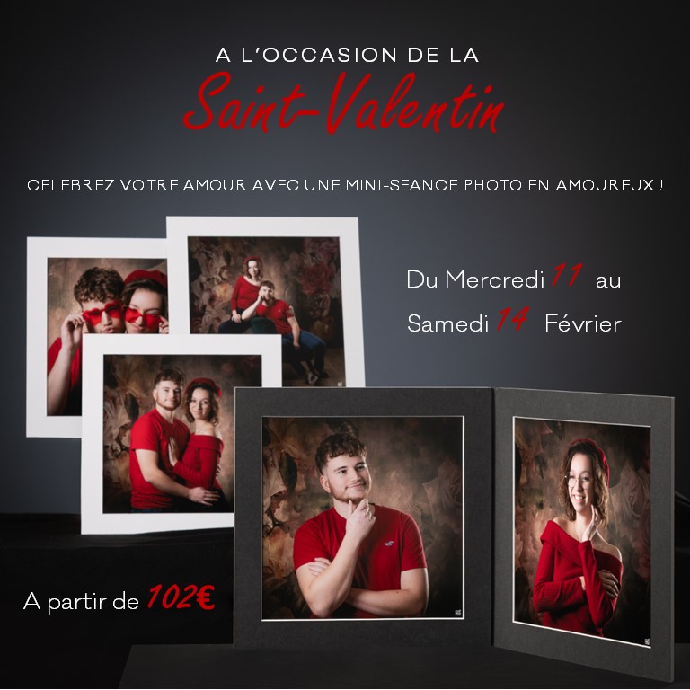 Du Mercredi 11 au Samedi 14 Février et à partir de 102€ au lieu de 141€ (séance + 1 tirage exclusivité St Valentin photo 25*25 dasn un passe partout 30*30)